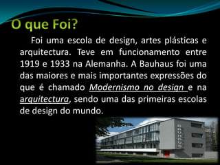 A Bauhaus foi uma escola de arte e design fundada na Alemanha em 1919 com o objetivo de combinar arquitetura, artesanato e artes. Sob a direção de Walter Gropius, a escola promovia a livre criação e a integração entre arte e tecnologia. Após enfrentar oposição dos conservadores, a Bauhaus mudou-se para Dessau em 1925, onde construiu novos prédios manifestando a arquitetura moderna. Em 1933, com a chegada dos nazistas ao poder, a escola foi fechada e seus