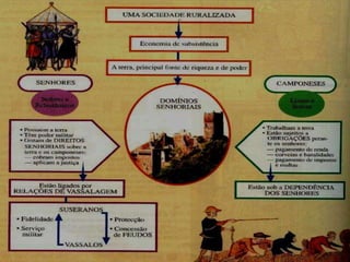 A Baixa Idade Média era caracterizada por uma economia agro-pastoril e auto-suficiente, com poder político descentralizado entre senhores feudais através de laços de vassalagem. A estrutura social consistia nos senhores feudais, clero e servos que deviam corvéias, talhas e banalidades aos senhores das terras. A partir do século XI, inovações tecnológicas e aumento populacional levaram a uma crise de produção e miséria, que as Cruzadas ajudaram a aliviar ao reabrir rot