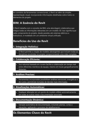 O documento explora o Autodesk Revit, uma ferramenta BIM que transforma a abordagem de projetos de construção, integrando informações em um modelo 3D. Destaca benefícios como colaboração em tempo real, análises precisas e atualizações automáticas, além de elementos-chave como famílias e componentes inteligentes. O texto também sugere maneiras de iniciar no uso do Revit, como treinamento e participação em comunidades online.