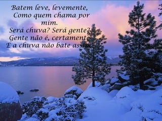 O poema descreve a queda de neve vista através de uma janela. A neve cobre tudo de branco e deixa marcas dos passos das pessoas, especialmente as pegadas pequenas e descalças de uma criança, o que provoca grande tristeza no narrador ao pensar na dor da criança.