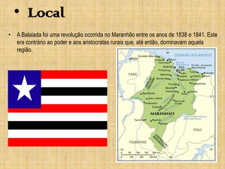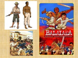A Balaiada foi uma revolta no Maranhão entre 1838-1841 contra os senhores de terras e autoridades locais. Liderada por Manuel Francisco e Raimundo Gomes, a revolta eclodiu após violência policial contra a família de Manuel e a prisão do irmão de Raimundo. Embora inicialmente bem-sucedida, a revolta foi reprimida pelo Duque de Caxias e os líderes foram mortos ou forçados a se render.