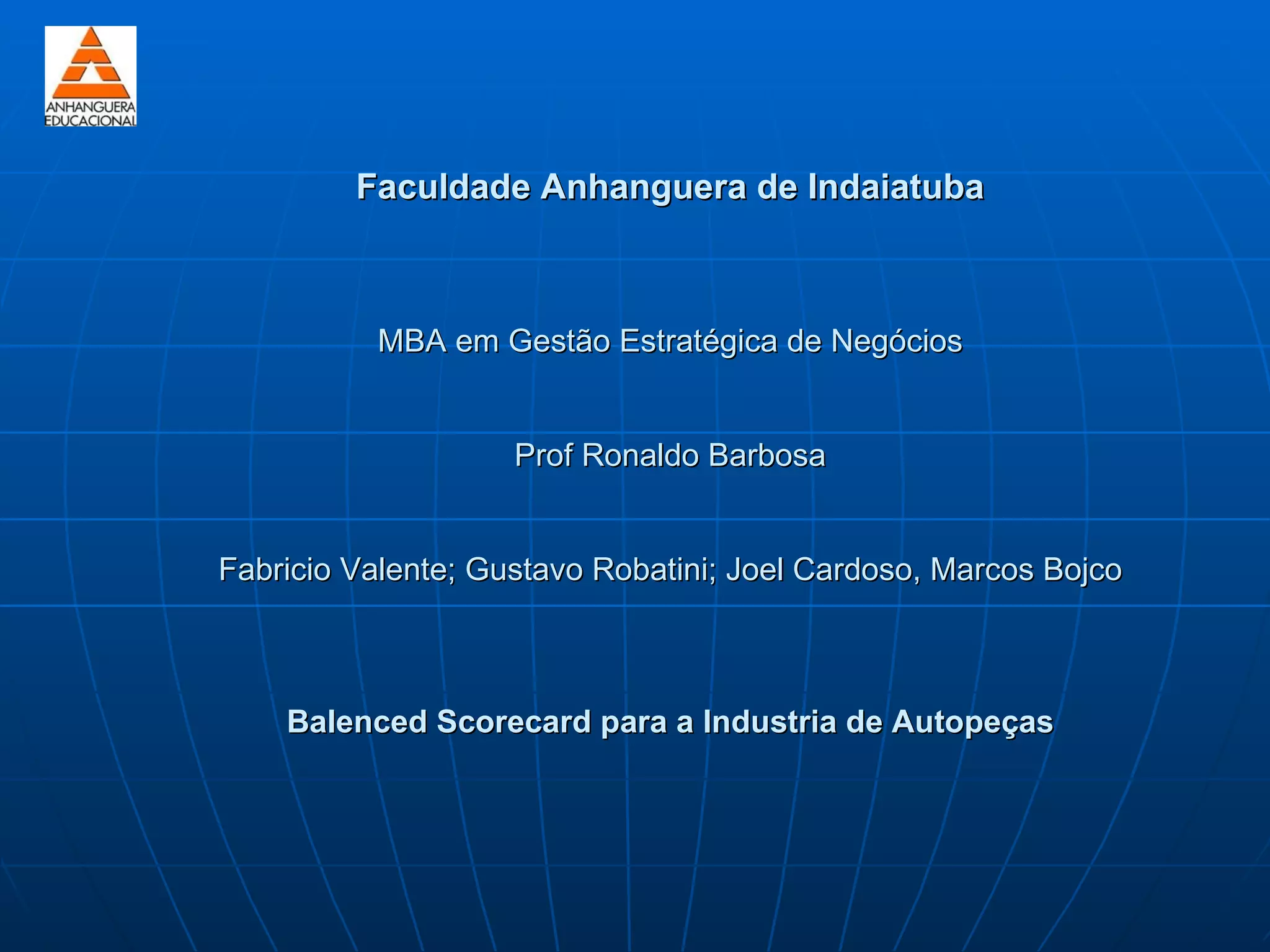 [1] O documento apresenta um modelo de Balanced Scorecard para medir o desempenho de uma empresa do setor de autopeças, com objetivos financeiros, de clientes, processos internos e aprendizado e crescimento. [2] O BSC é descrito como tendo quatro perspectivas básicas e uma implementação em sete etapas. [3] Os benefícios incluem alinhar a estratégia, aplicar indicadores, ter uma visão sistematizada do desempenho e incentivar o aprendizado contínuo.