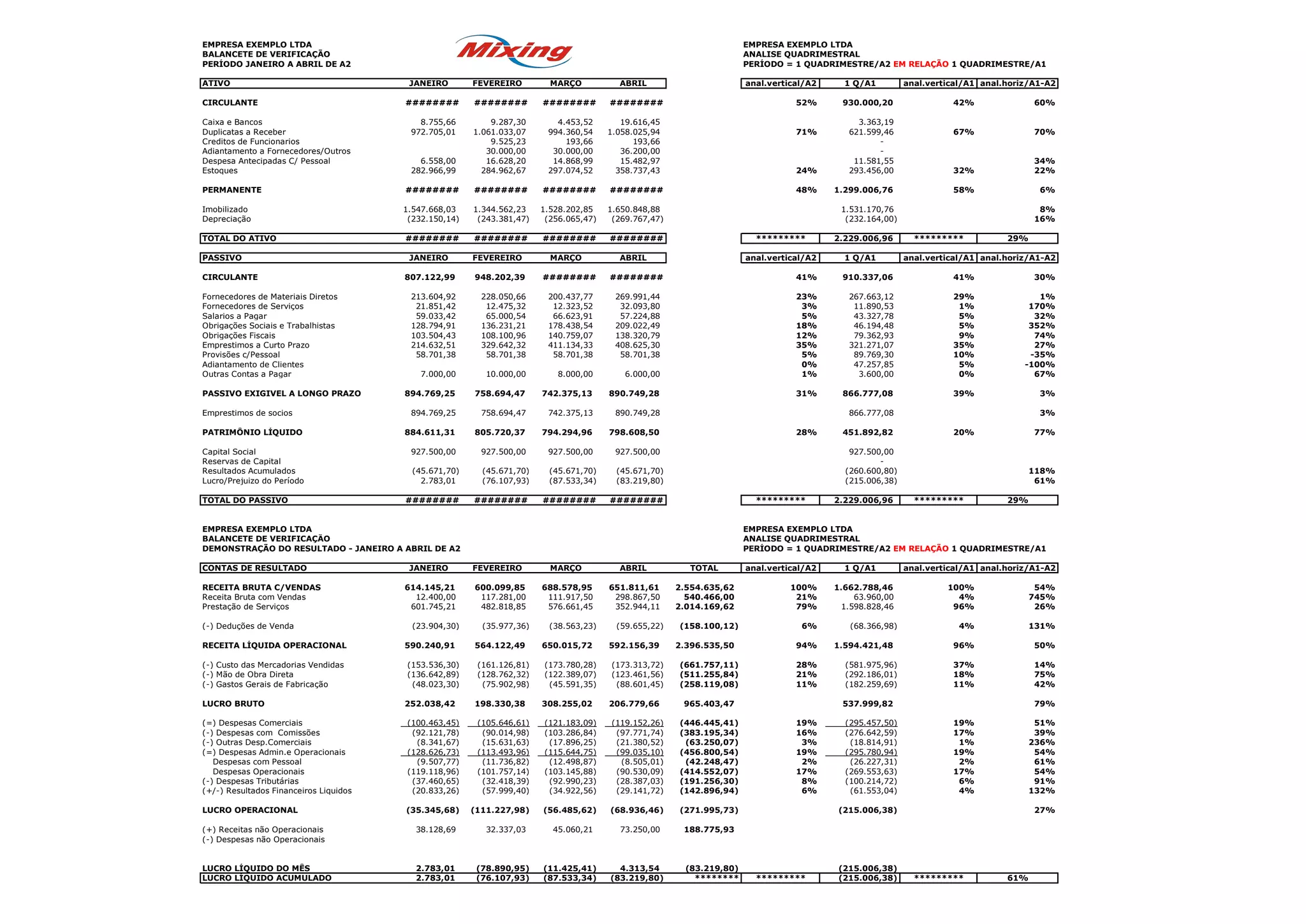 O documento apresenta os balanços patrimoniais e demonstrações de resultado de uma empresa para os meses de janeiro a abril de um ano. O balanço patrimonial mostra que 52% do ativo é circulante, com destaque para duplicatas a receber, e 48% é permanente, com destaque para imobilizado. No passivo, 41% é circulante, com destaque para empréstimos a curto prazo, e 31% é exigível a longo prazo, com empréstimos de sócios. A demonstração de resultado apresenta a receita líquida, custos