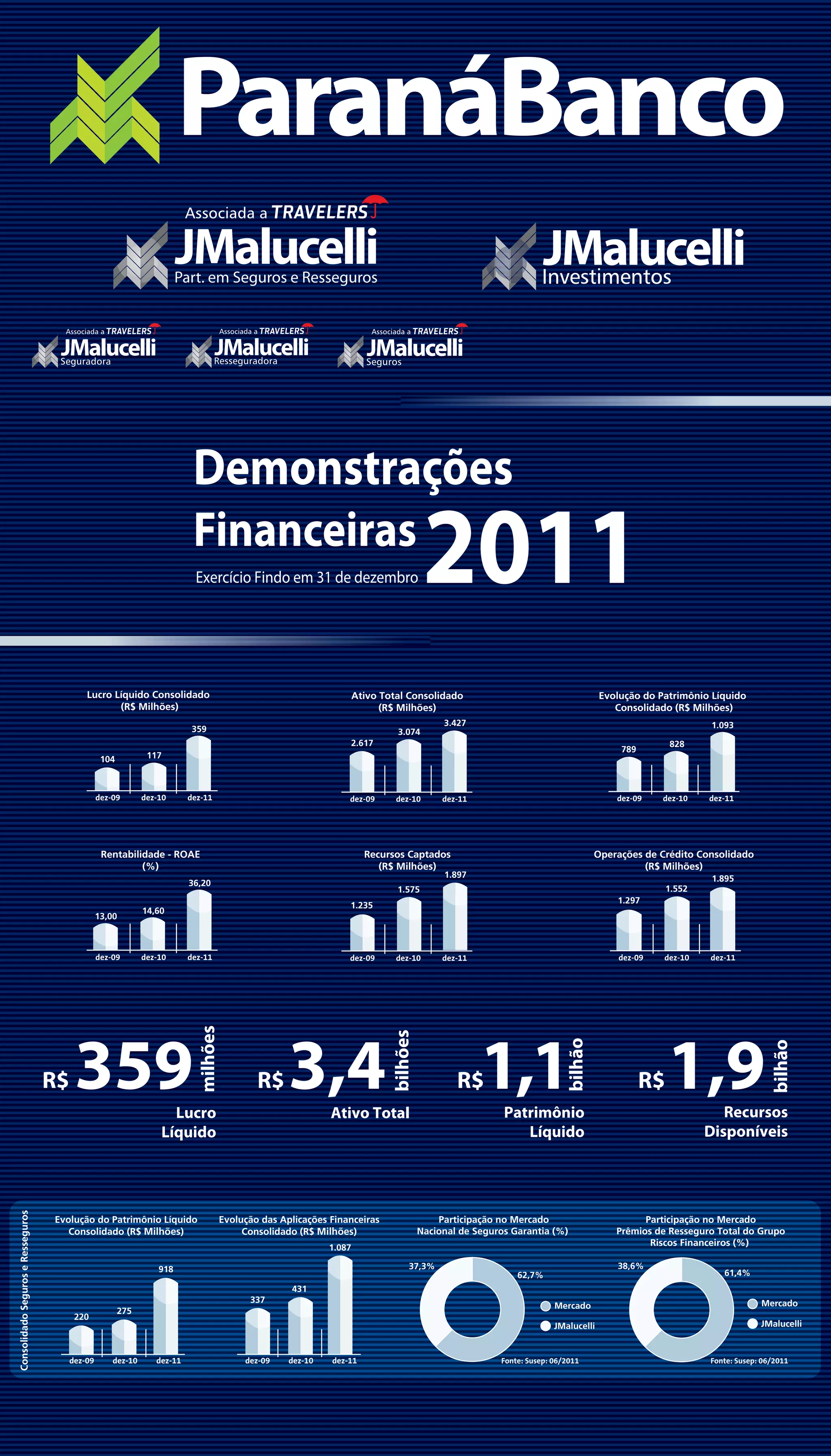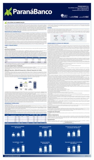 O documento apresenta as demonstrações financeiras consolidadas de 2011 de um grupo empresarial que atua nos setores bancário, de seguros e resseguros. O grupo teve crescimento de ativos, patrimônio líquido e lucro líquido. A carteira de crédito cresceu 21,2% e a inadimplência ficou estável. As seguradoras do grupo tiveram lucro líquido 50,7% maior que em 2010.