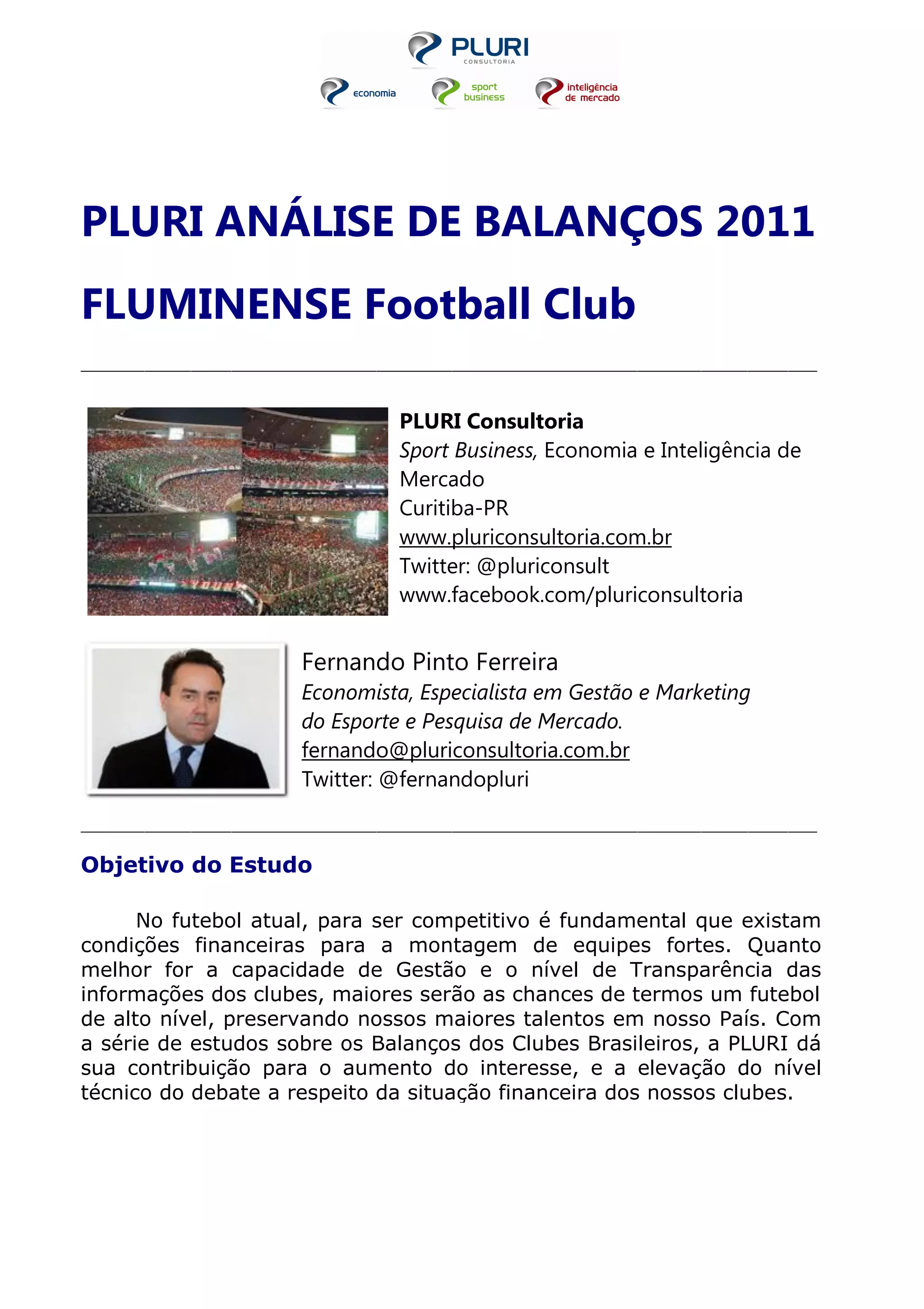 O relatório resume o balanço patrimonial do Fluminense em 2011, destacando que as receitas cresceram 4% enquanto as despesas subiram 22%, ampliando o déficit operacional. O clube também apresentou prejuízo líquido de R$ 34 milhões e endividamento de R$ 405 milhões. Apesar disso, o Fluminense obteve bons resultados esportivos, ficando em 4o no ranking de conquistas da PLURI.