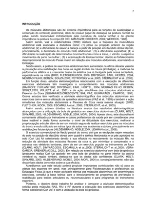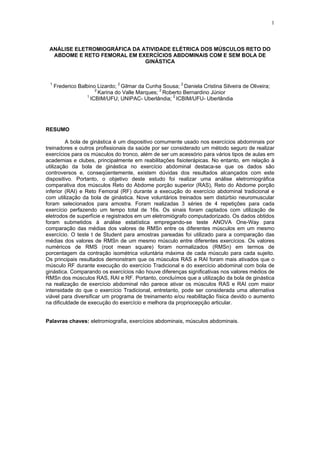 O documento analisa a atividade elétrica dos músculos reto do abdome e reto femoral em exercícios abdominais com e sem bola de ginástica. Os principais resultados demonstraram que os músculos reto do abdome superior e inferior foram mais ativados que o músculo reto femoral durante os exercícios, e não houve diferenças significativas nos níveis de ativação entre os exercícios com e sem bola.
