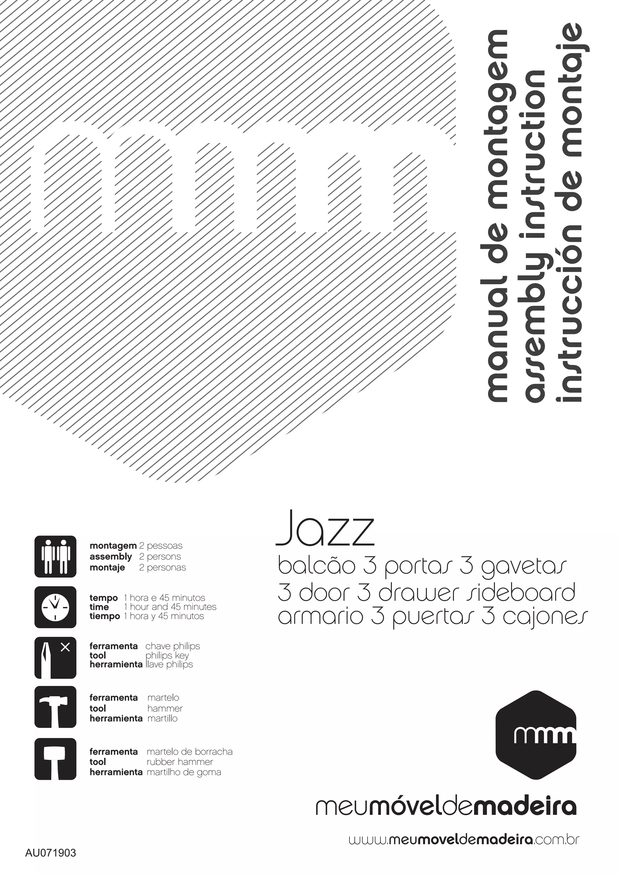 O documento fornece instruções detalhadas para a montagem de um balcão de 3 portas e 3 gavetas, que deve ser realizado por duas pessoas em uma superfície limpa. A montagem leva cerca de 1 hora e 45 minutos e requer ferramentas específicas, como chave Philips e martelo. Além disso, são listadas precauções a serem observadas durante o processo de montagem.