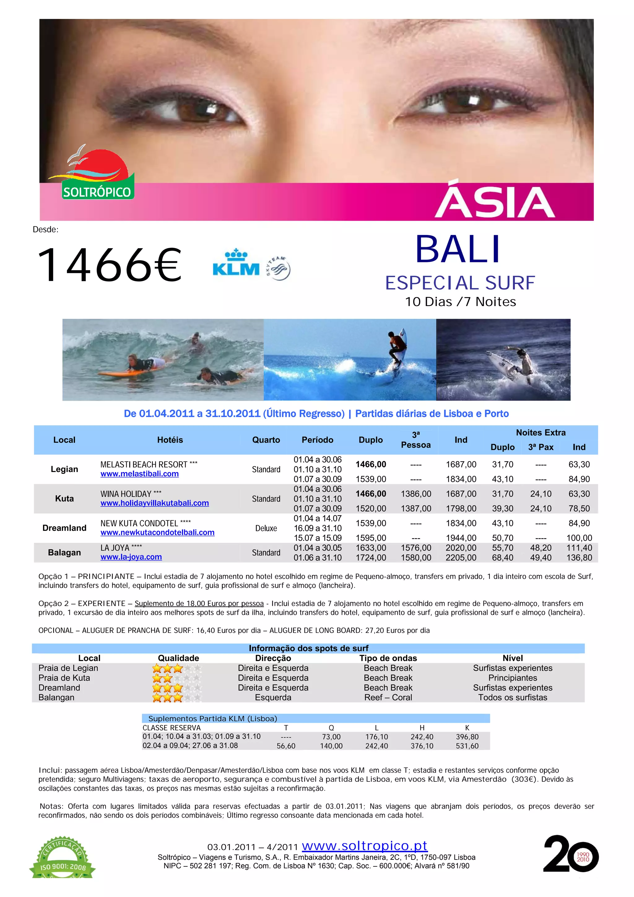 Este documento oferece pacotes de férias de 10 dias e 7 noites em Bali, Indonésia, com foco em surf. Inclui opções de hotéis em diferentes áreas de Bali com preços variando de 1.386€ a 1.724€ dependendo da localização e temporada. Oferece também aulas de surf para iniciantes e experientes, aluguel de pranchas e informações sobre os melhores locais para surf na ilha.