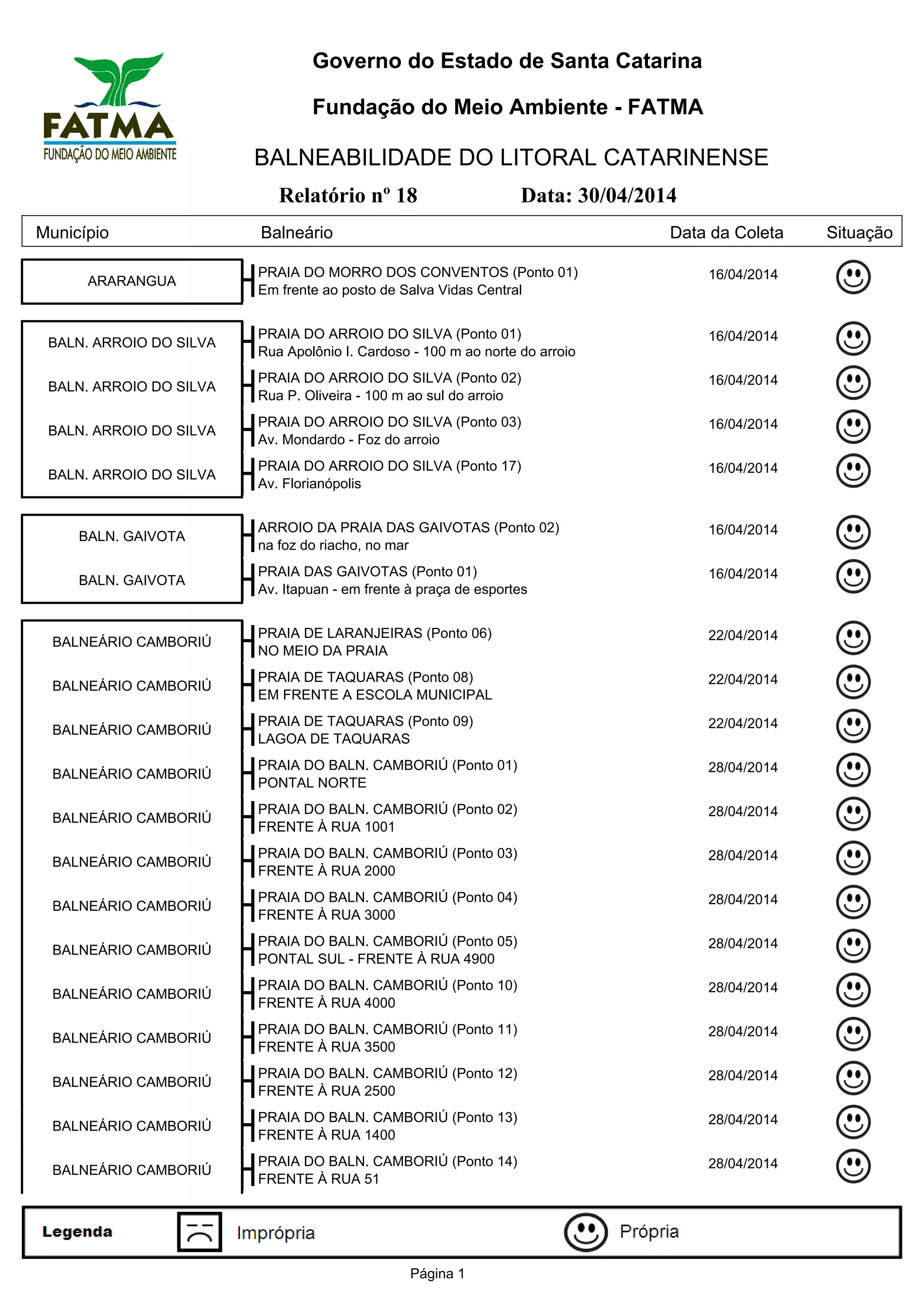 O relatório apresenta os resultados dos testes de balneabilidade realizados em vários pontos do litoral catarinense entre os dias 8 e 30 de abril de 2014. Foram analisadas amostras de água coletadas em praias, lagos e arroios de diversos municípios, incluindo Balneário Camboriú, Bombinhas, Florianópolis e outros. Para cada ponto amostrado, é informada a data da coleta e o local específico.