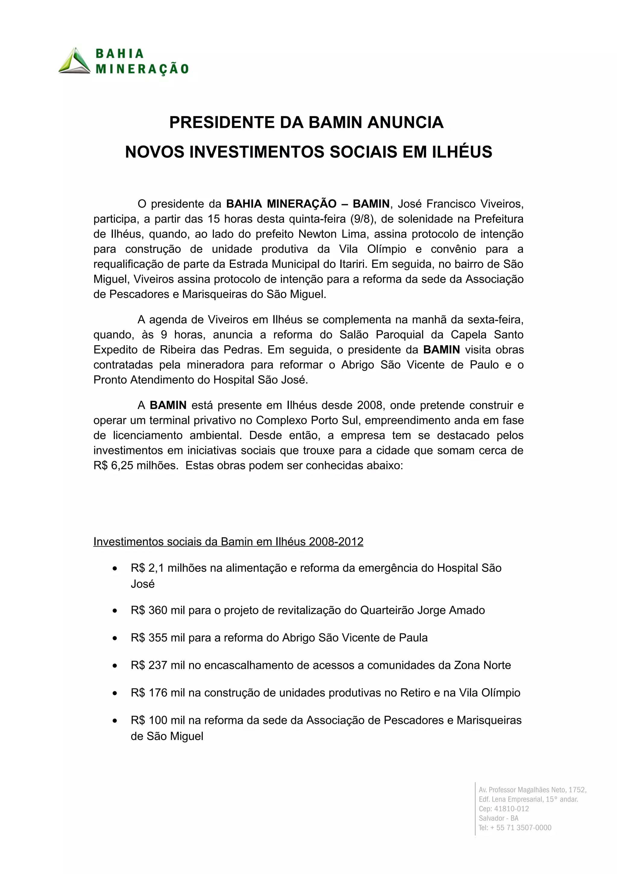 O presidente da BAMIN anuncia novos investimentos sociais em Ilhéus, incluindo a construção de uma unidade produtiva e a requalificação de uma estrada municipal. A empresa já investiu R$6,25 milhões em projetos sociais na cidade desde 2008.