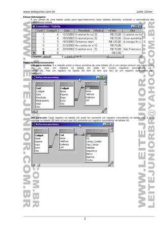 O documento fornece uma introdução sobre bancos de dados, incluindo suas principais estruturas e conceitos como tabelas, campos, registros e sistemas gerenciadores de bancos de dados. Também descreve os principais tipos de relacionamentos entre tabelas e explica brevemente as linguagens SQL e DDL/DML para manipulação e definição de dados.
