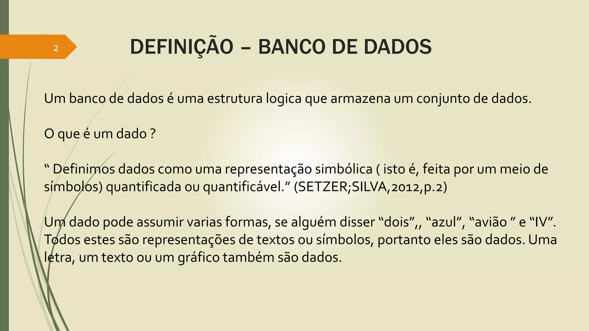 1) Definição de banco de dados como uma estrutura lógica para armazenar dados de forma organizada;