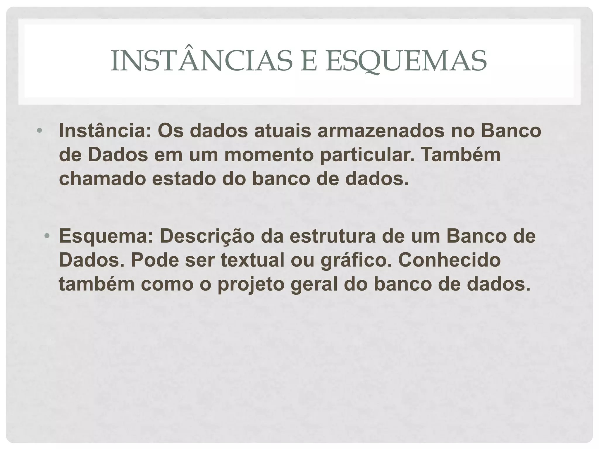 O documento descreve conceitos fundamentais de bancos de dados, incluindo instâncias, esquemas, independência de dados, modelos de dados, modelo entidade-relacionamento e a linguagem SQL.