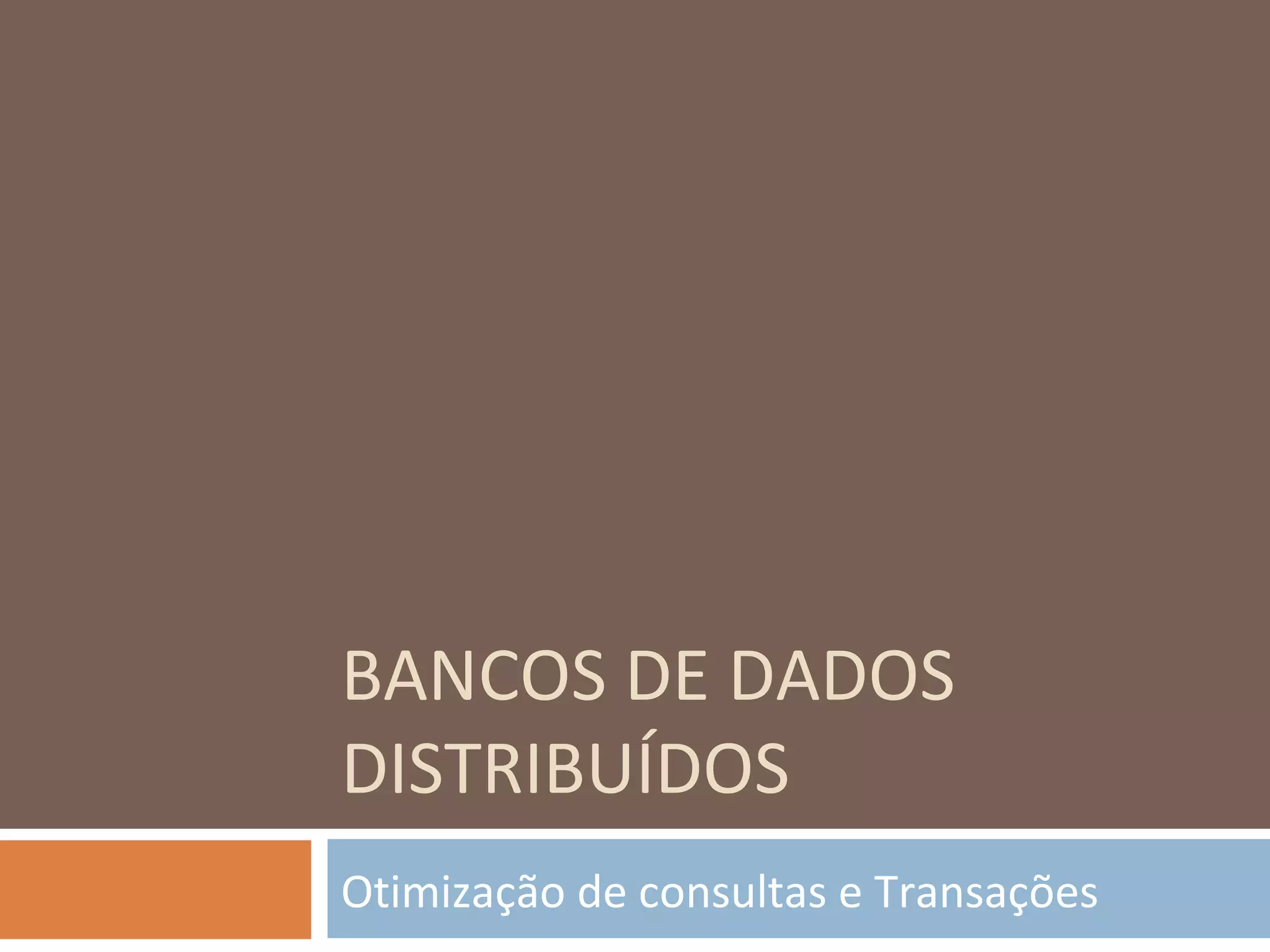 O documento discute otimização de consultas e transações em bancos de dados distribuídos. Explica como fatores como replicação, fragmentação e capacidade de processamento influenciam a otimização de consultas, que ocorre em duas etapas: global e local. Também aborda coordenação de transações distribuídas, tratamento de fal