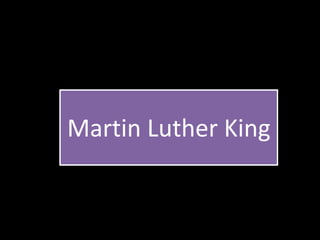 O documento apresenta imagens e informações sobre a luta pelos direitos civis dos negros nos Estados Unidos, com foco nas décadas de 1950 e 1960. Mostra Martin Luther King sendo preso e assinando a Lei dos Direitos Civis de 1964, além de diversas manifestações pacíficas e atos de desobediência civil, como sit-ins, para pressionar pela igualdade racial e pelo fim da segregação, apesar da forte repressão policial da época.