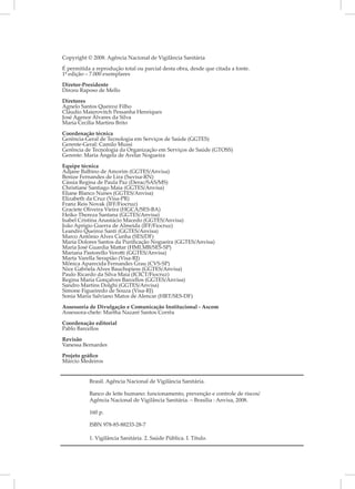 Este documento apresenta as diretrizes para o funcionamento, prevenção e controle de riscos em bancos de leite humano. Ele aborda tópicos como organização do banco de leite, infraestrutura física, equipamentos, higiene, processamento do leite, controle de qualidade e distribuição, com foco na prevenção de riscos à saúde. O objetivo é fornecer orientações técnicas para assegurar a segurança do processamento e administração do leite humano.