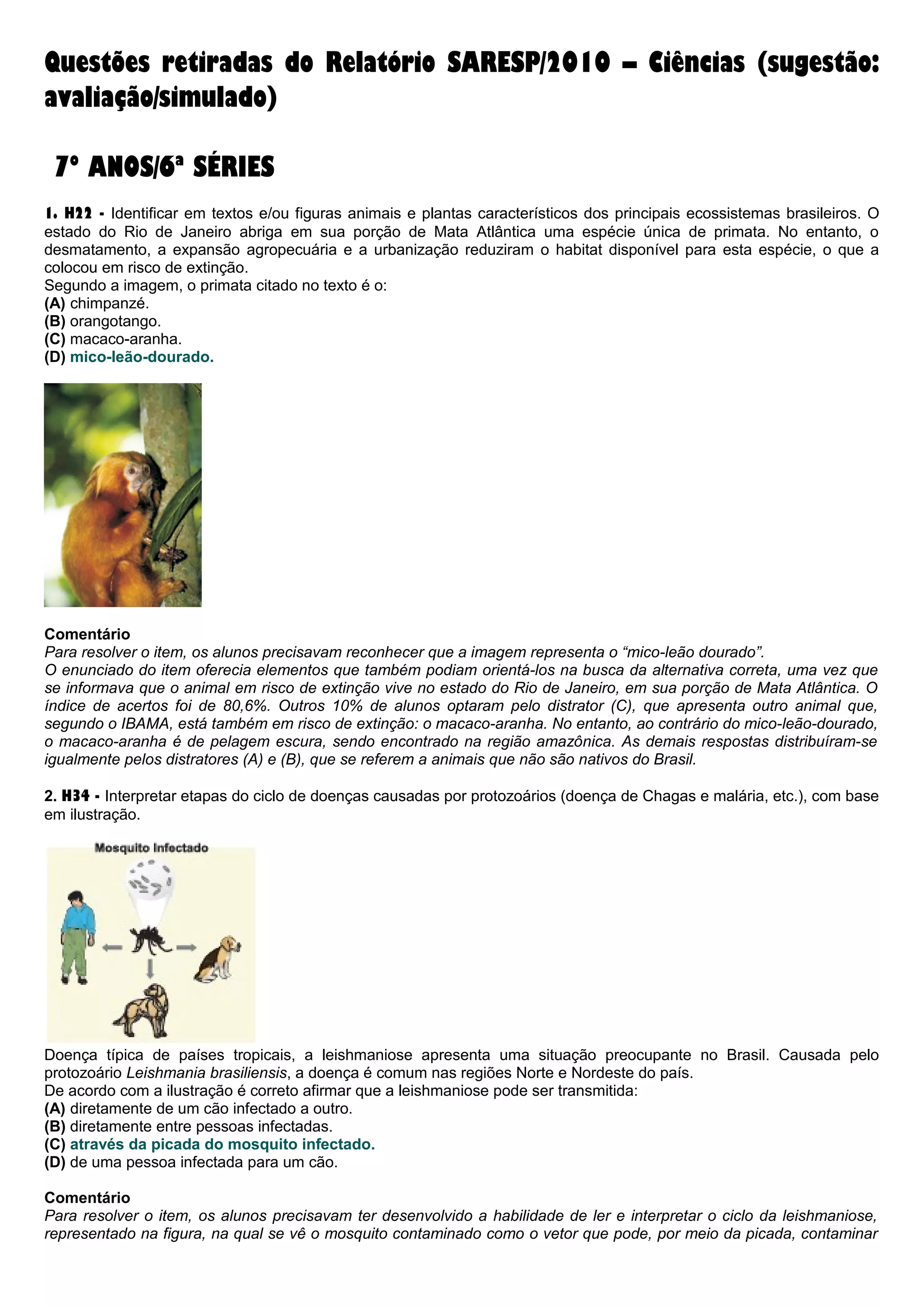 O documento apresenta 10 questões retiradas de uma prova de Ciências sobre diversos temas como ecossistemas, doenças, saneamento básico e classificação biológica. As questões abordam animais, plantas, protozoários, fungos e outros seres vivos, com o objetivo de avaliar os conhecimentos dos alunos sobre esses assuntos.