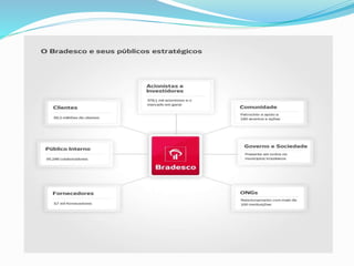 O documento apresenta o Bradesco, o segundo maior banco privado do Brasil. Fundado em 1943, o Bradesco se expandiu através de fusões e aquisições e sua estratégia inicial foi atrair pequenos comerciantes e funcionários públicos. Atualmente, sua visão é ser reconhecida como a melhor instituição financeira do país, promovendo inclusão bancária e desenvolvimento sustentável. O Bradesco é regulado por órgãos como o Banco Central e tem clientes, acionistas e governo como públicos estratégicos.