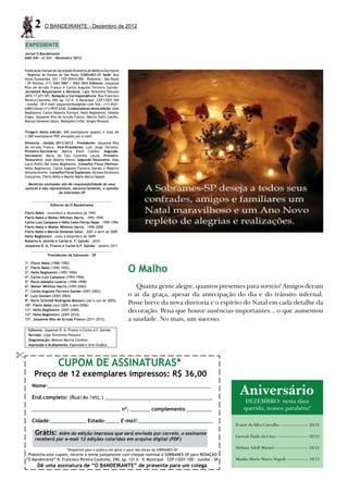O documento resume as atividades da Sociedade Brasileira de Médicos Escritores - Regional do Estado de São Paulo (SOBRAMES-SP) no mês de dezembro de 2012. A organização promoveu sua tradicional festa de Natal em família, além de realizar sua Pizza Literária mensal com apresentações de textos e homenagens. A diretoria da SOBRAMES-SP para o biênio 2013-2014 também foi empossada na ocasião.