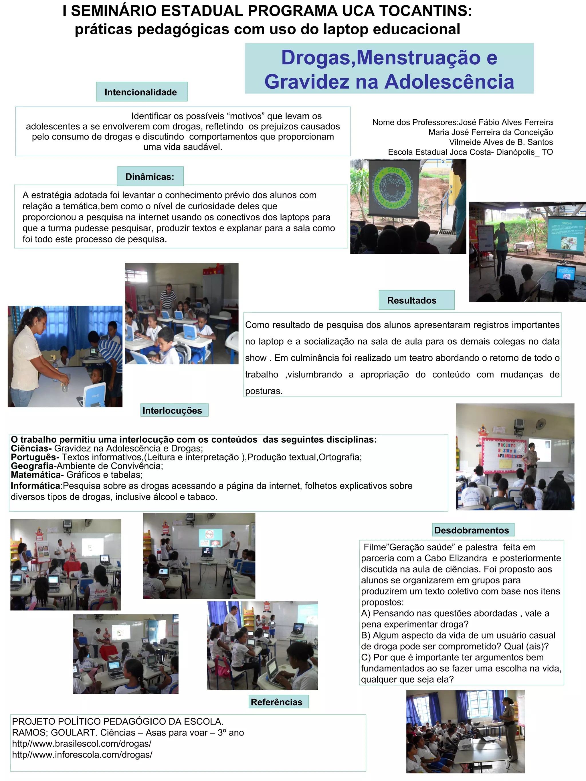 O documento discute um projeto realizado em uma escola estadual no Tocantins para ensinar estudantes sobre os perigos das drogas. Os professores conduziram pesquisas na internet e atividades em grupo para explorar os motivos do uso de drogas por adolescentes e seus efeitos negativos na saúde e na vida. Os alunos apresentaram seus achados e discutiram comportamentos saudáveis.