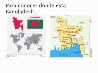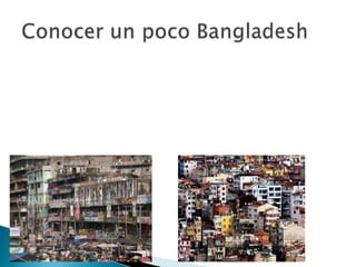 Este documento fornece informações gerais sobre Bangladesh e a vida nos campos de refugiados. Descreve como as pessoas vivem em Bangladesh, comendo principalmente arroz e banana, e trabalhando principalmente na agricultura. Também explica como é a vida nos campos de refugiados, onde as pessoas vivem em condições precárias e dependem de ajuda para sobreviver.