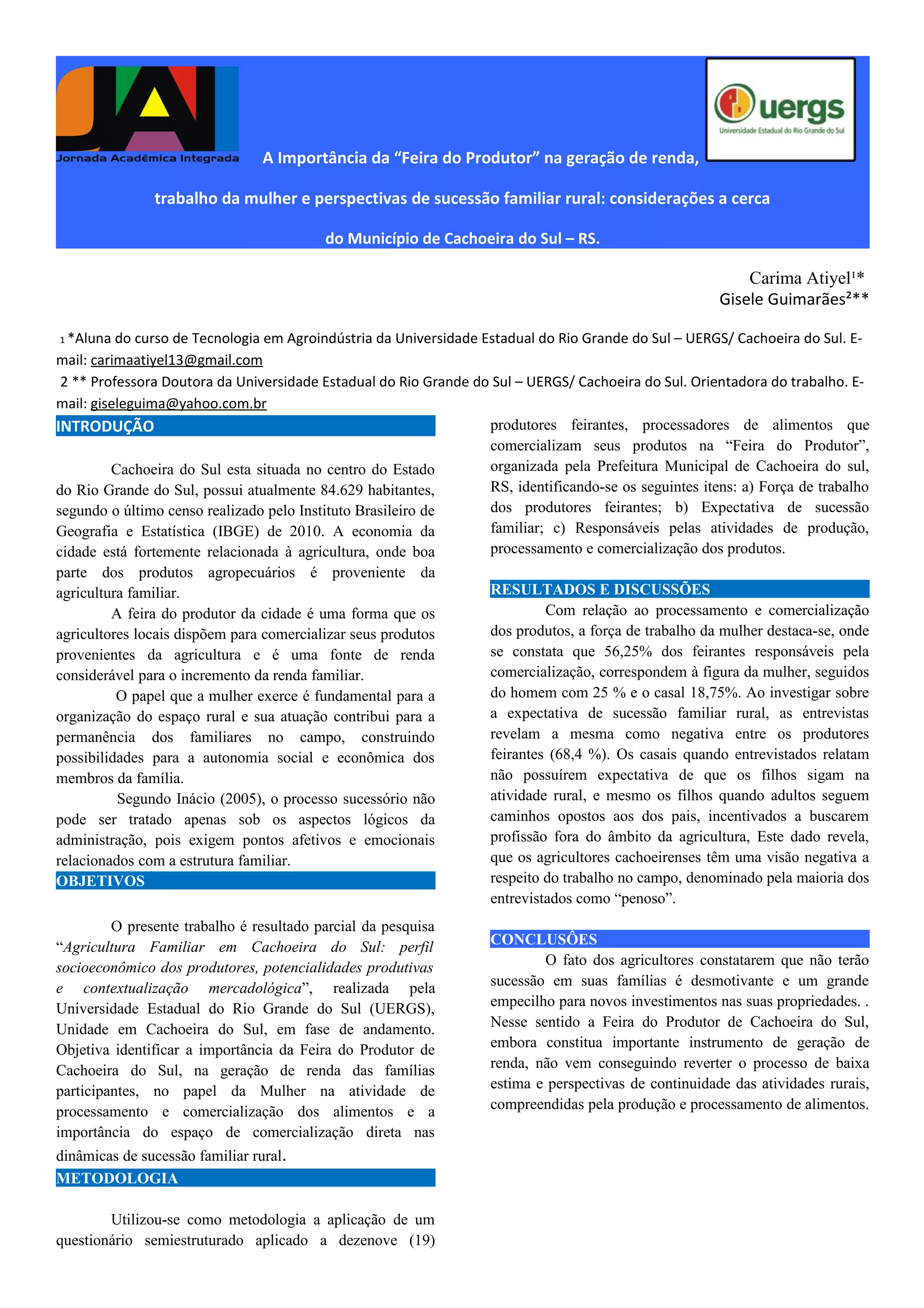 O documento discute a importância da Feira do Produtor na geração de renda para famílias rurais em Cachoeira do Sul, RS. A pesquisa mostra que a maioria (56,25%) dos vendedores na feira são mulheres. No entanto, a maioria dos agricultores (68,4%) não espera que seus filhos continuem trabalhando na agricultura, o que pode comprometer o futuro do setor. Apesar de gerar renda, a feira não tem revertido a baixa estima e perspectivas negativas em relação à contin