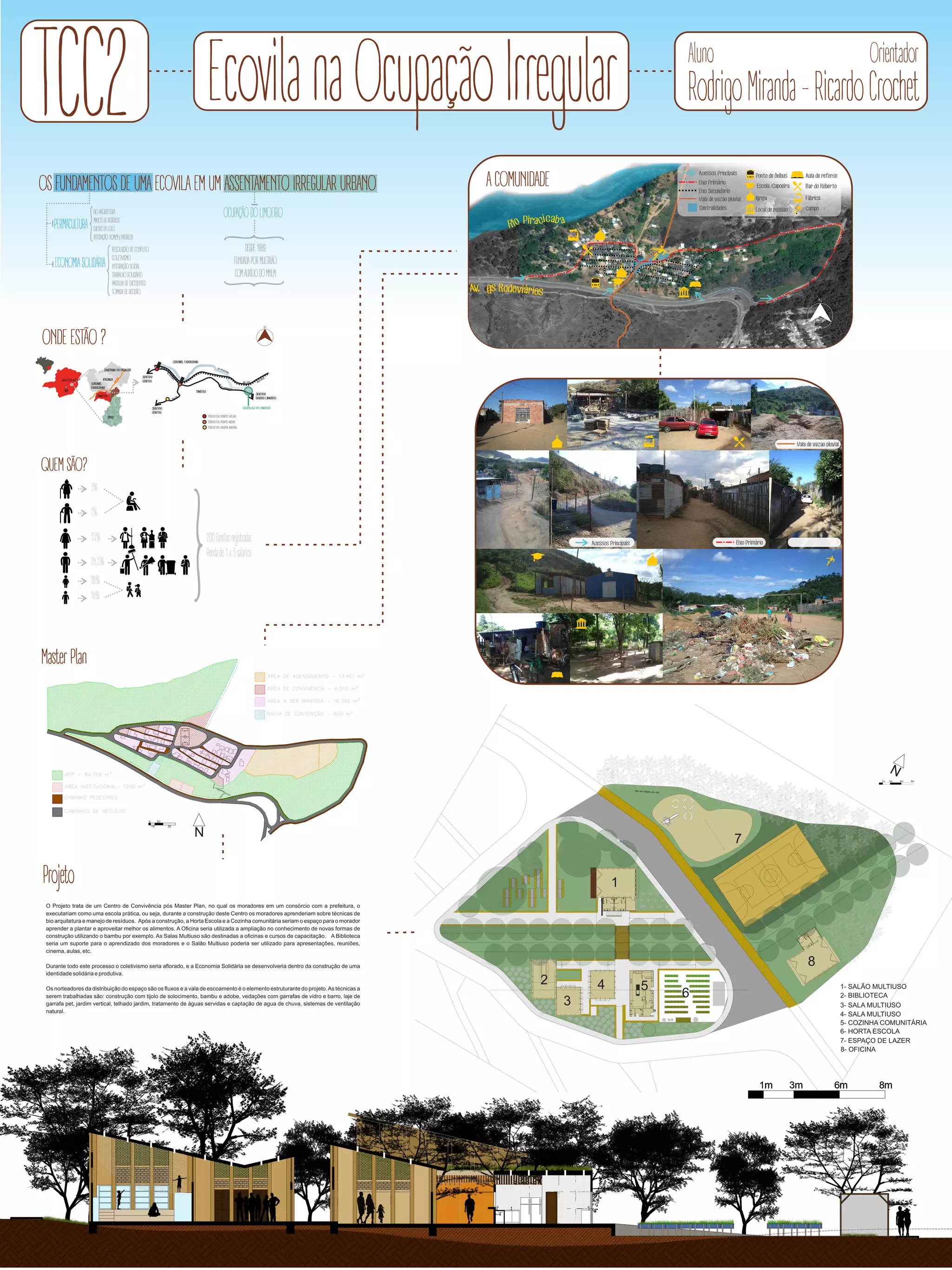 O documento descreve uma ecovila em uma ocupação irregular urbana no Vale do Aço em Minas Gerais. A ecovila promove princípios de permacultura, economia solidária e bioarquitetura, além de integrar os moradores à natureza e promover a resolução de conflitos de forma coletiva. O texto também apresenta um projeto para um centro comunitário na ocupação, com espaços para cursos, horta, cozinha e oficinas para ensinar novas técnicas de construção sustentável.