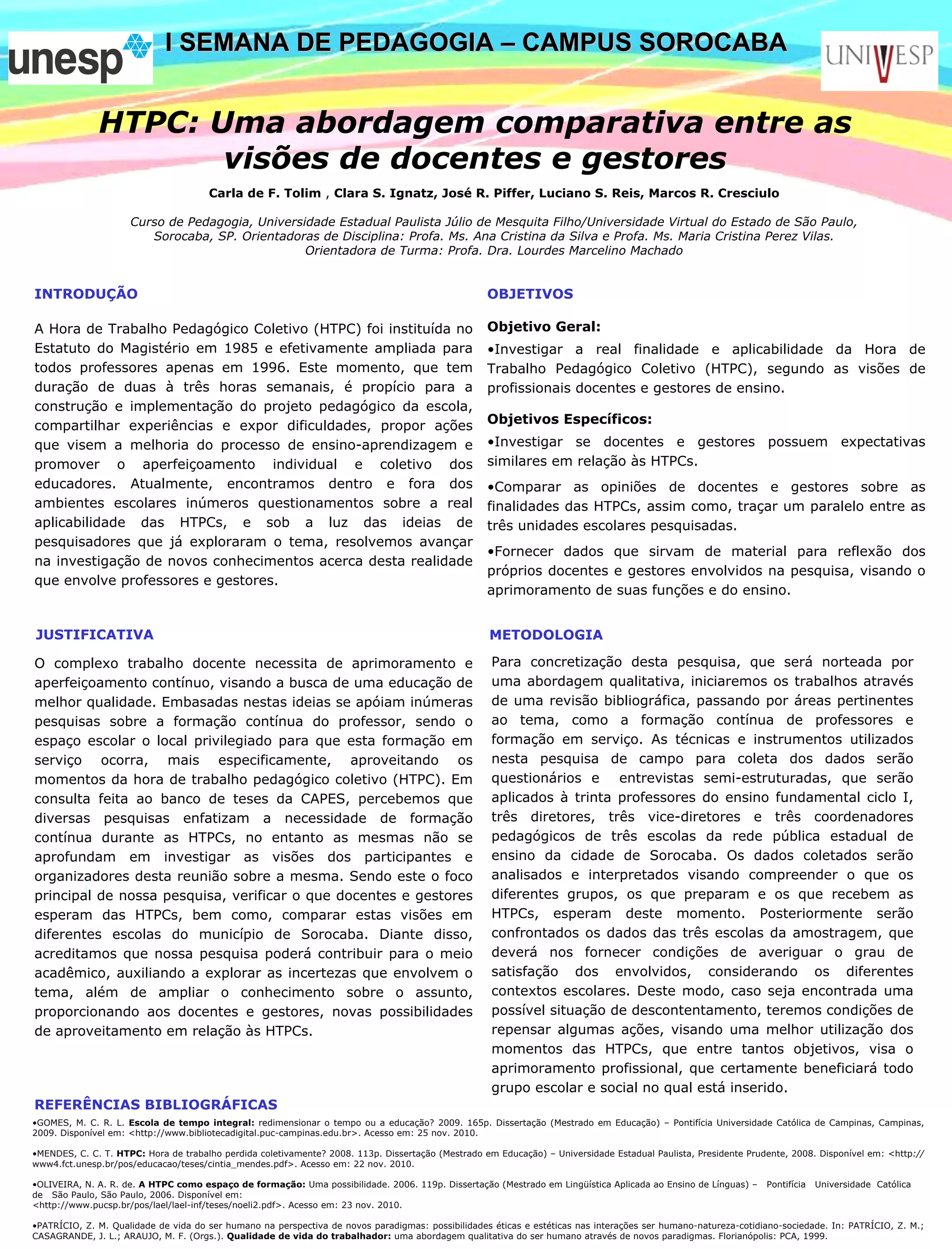 O documento discute a Hora de Trabalho Pedagógico Coletivo (HTPC) na perspectiva de docentes e gestores. O objetivo geral é investigar a real finalidade e aplicabilidade da HTPC de acordo com as visões desses profissionais. Os objetivos específicos são: comparar as expectativas de docentes e gestores sobre as HTPCs; analisar as opiniões sobre as finalidades das HTPCs em três escolas; e fornecer dados para reflexão sobre o aprimoramento das funções docentes e do ensino. A metodologia inclui
