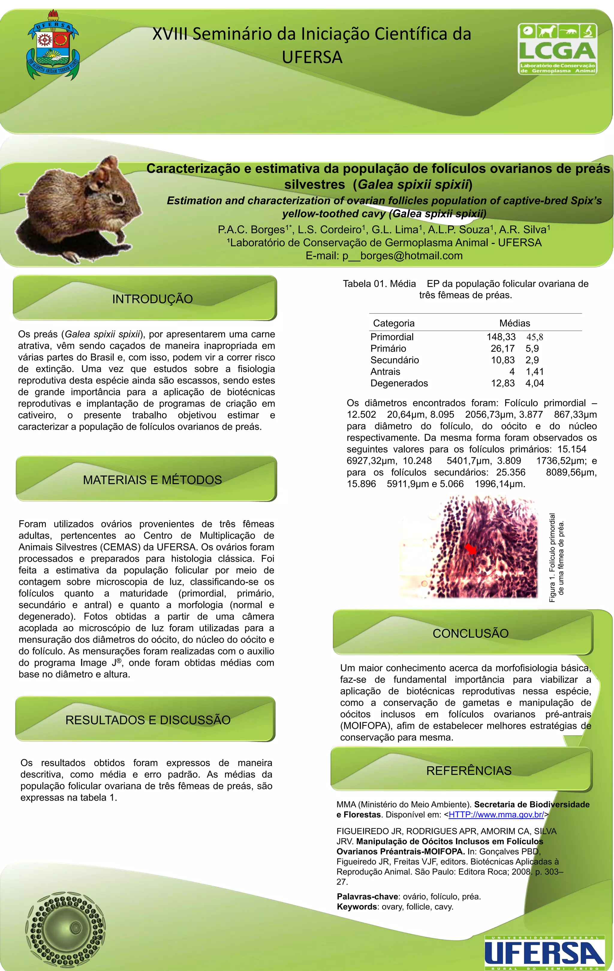 Este documento resume um estudo sobre a caracterização e estimativa da população de folículos ovarianos de preás silvestres (Galea spixii spixii). Os resultados mostram que as fêmeas tinham principalmente folículos primordiais (média de 148,33), com diâmetros variando de acordo com o estágio de desenvolvimento. Um melhor entendimento da fisiologia reprodutiva destes animais é essencial para a aplicação de técnicas de reprodução assistida e conservação da espécie.