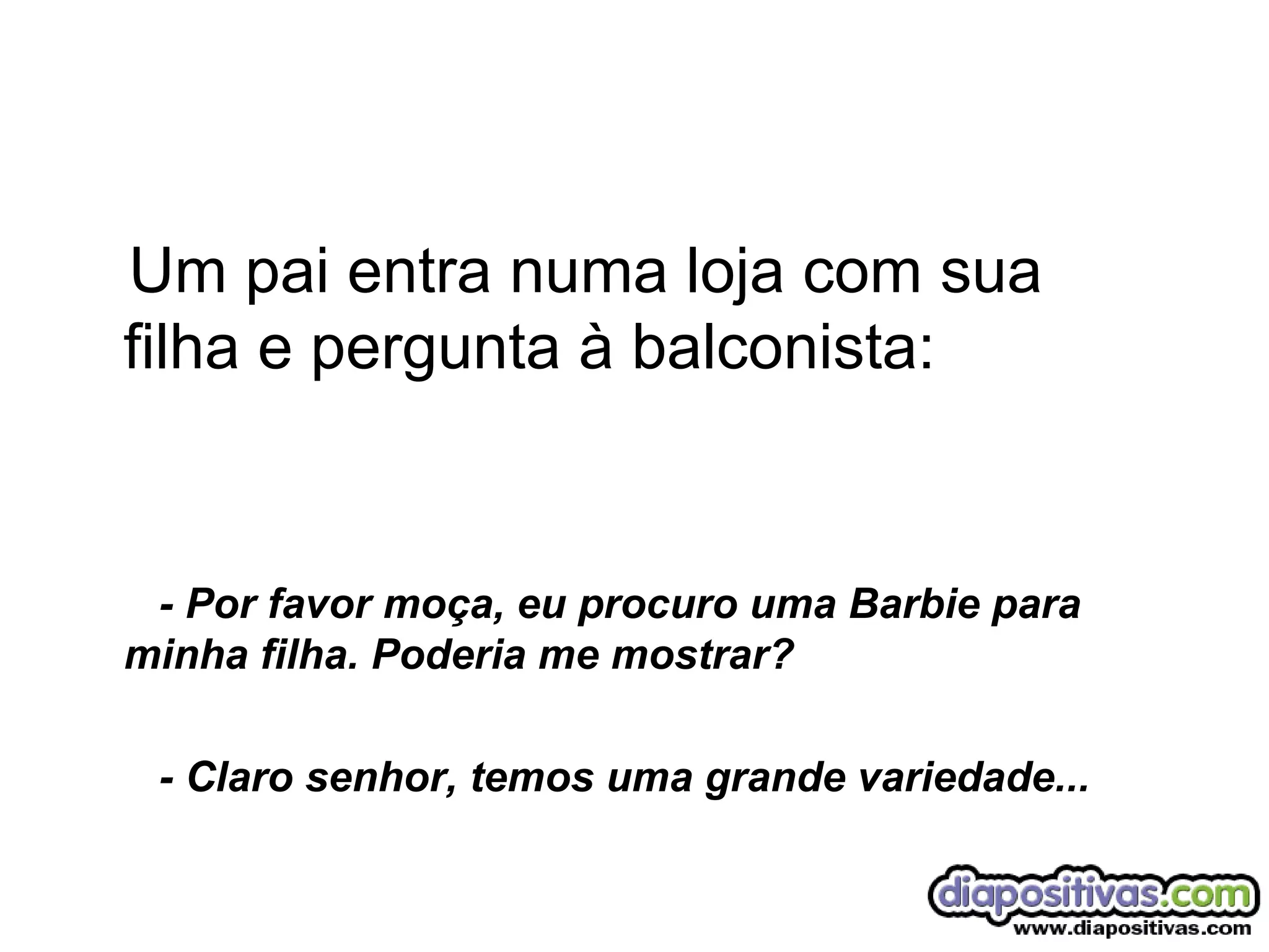 Um pai entranuma loja com sua filha e pergunta à balconista: - Por favor moça, eu procuro uma Barbie para minha filha. Poderia me mostrar? - Claro senhor, temos uma grande variedade...