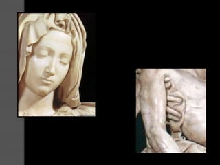 O documento compara esculturas do Renascimento e Barroco, destacando semelhanças e diferenças entre o David de Miguel Ângelo e de Bernini, como o uso do movimento, dramatismo e contraste de texturas no Barroco. Também analisa esculturas de Bernini como "Éxtase de Santa Teresa" e "Beata Ludovica Albertoni", enfatizando o movimento, expressão dramática e contraste de materiais.