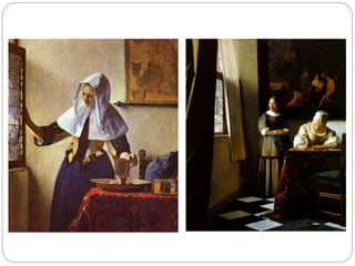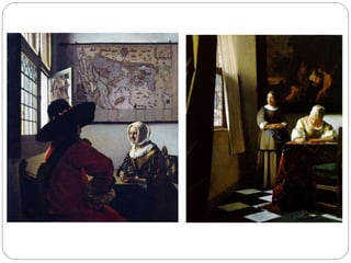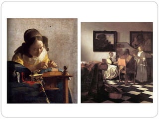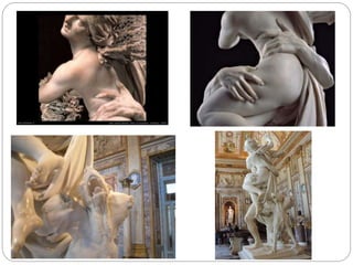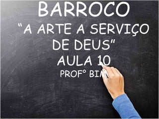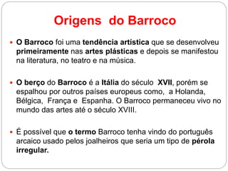 O documento resume as origens e características principais do estilo artístico Barroco, que surgiu na Itália do século XVII em resposta à Contrarreforma Católica contra a Reforma Protestante e se espalhou pela Europa. Destaca os principais artistas como Caravaggio, Rubens e Velázquez e suas obras mais representativas que buscavam impactar os sentidos e emoções dos espectadores.