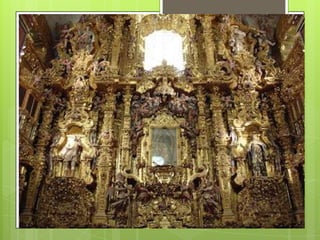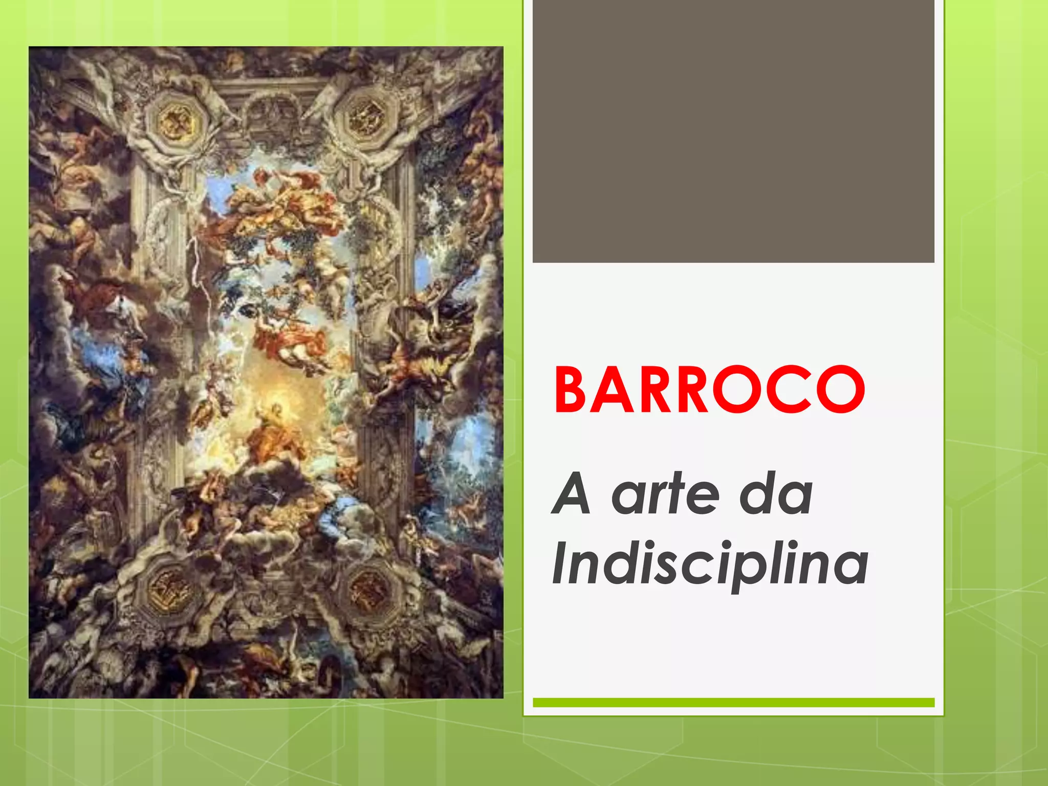 O documento descreve o estilo artístico Barroco que surgiu durante a crise do Renascimento. As principais características do Barroco incluem o uso de alegorias, frases interrogativas, ordem inversa, cultismo e conceptismo. Alguns dos principais autores do período Barroco foram Gregório de Matos, Padre Antônio Vieira, Bento Teixeira e Manuel de Oliveira.