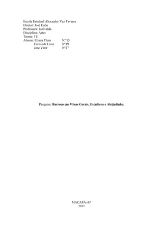 O documento descreve a escultura do período Barroco em Minas Gerais entre os séculos XVIII e XIX. Destaca a diversidade e o ecletismo da produção artística mineira, diferentemente de outras escolas como a da Bahia. Aponta Aleijadinho como o principal expoente do barroco brasileiro, conhecido por suas obras em Congonhas representando cenas bíblicas.