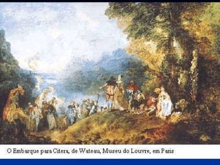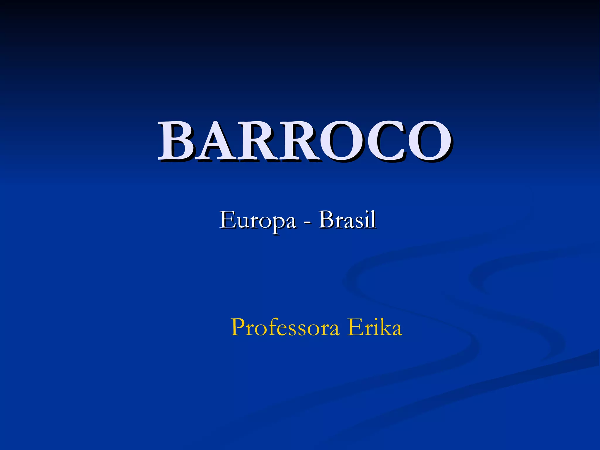 O documento descreve as origens e características da arte barroca na Europa e no Brasil. O estilo barroco surgiu na Itália no século XVII e se caracterizou por romper com o equilíbrio renascentista em favor da emoção. A arte barroca buscava impressionar os sentidos do observador através de curvas, contrastes e efeitos ilusionistas.