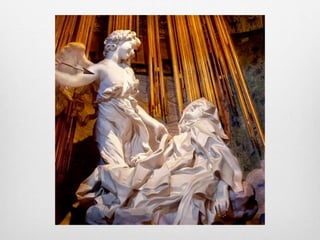 O documento discute as características gerais do estilo barroco, incluindo seu surgimento na Itália como contra-reforma católica e diferenças regionais. Apresenta também biografias resumidas de Bernini, escultor e arquiteto barroco italiano, e de Hyacinthe Rigaud, retratista barroco francês.