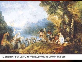 1) O documento descreve o estilo barroco na arte européia e brasileira, caracterizado pela ênfase nas emoções em vez da razão e busca por efeitos visuais dramáticos.
