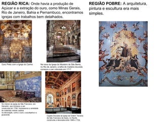 O documento descreve a arquitetura e arte barroca no Brasil colonial. Nas regiões ricas em mineração de ouro e produção de açúcar, como Minas Gerais e Bahia, as igrejas eram altamente decoradas com ouro, azulejos e madeiras nobres. Nas regiões mais pobres, a arquitetura e arte eram mais simples. O documento também destaca o trabalho do escultor Aleijadinho nas Capelas dos Passos em Congonhas.