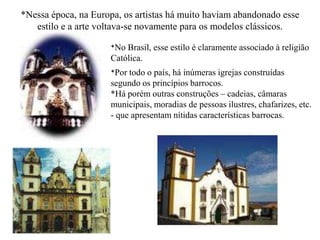 O Barroco se desenvolveu plenamente no Brasil dos séculos XVIII e XIX, associado principalmente à arquitetura religiosa católica. Regiões como Minas Gerais, Rio de Janeiro e Bahia apresentam igrejas ricamente decoradas, enquanto São Paulo tem estilo mais modesto. O Barroco mineiro se destaca pela arquitetura harmoniosa e esculturas de Aleijadinho.