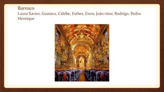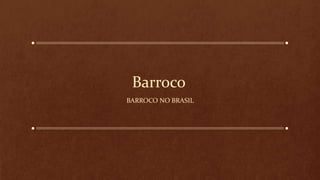 O movimento barroco surgiu na Europa no final do século XVI e se difundiu para países católicos, incluindo o Brasil, onde foi introduzido por missionários jesuítas no período colonial. No Brasil, o barroco dominou as artes sacras com obras como as esculturas e pinturas de Aleijadinho. O estilo se caracterizou pela ênfase nas contradições humanas e no dinamismo através do uso de figuras de linguagem como a antítese e a hipérbole.