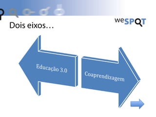 O documento discute os estilos de coaprendizagem para a educação 3.0. Aprendizagem colaborativa e participativa é importante para a sociedade digital. Novas tecnologias como redes sociais permitem novas formas de aprender de forma aberta e flexível. Os estilos de coaprendizagem podem ser entendidos como diversos modos de aprender colaborativamente online e serão estudados para orientar estratégias pedagógicas na web 2.0 e 3.0.