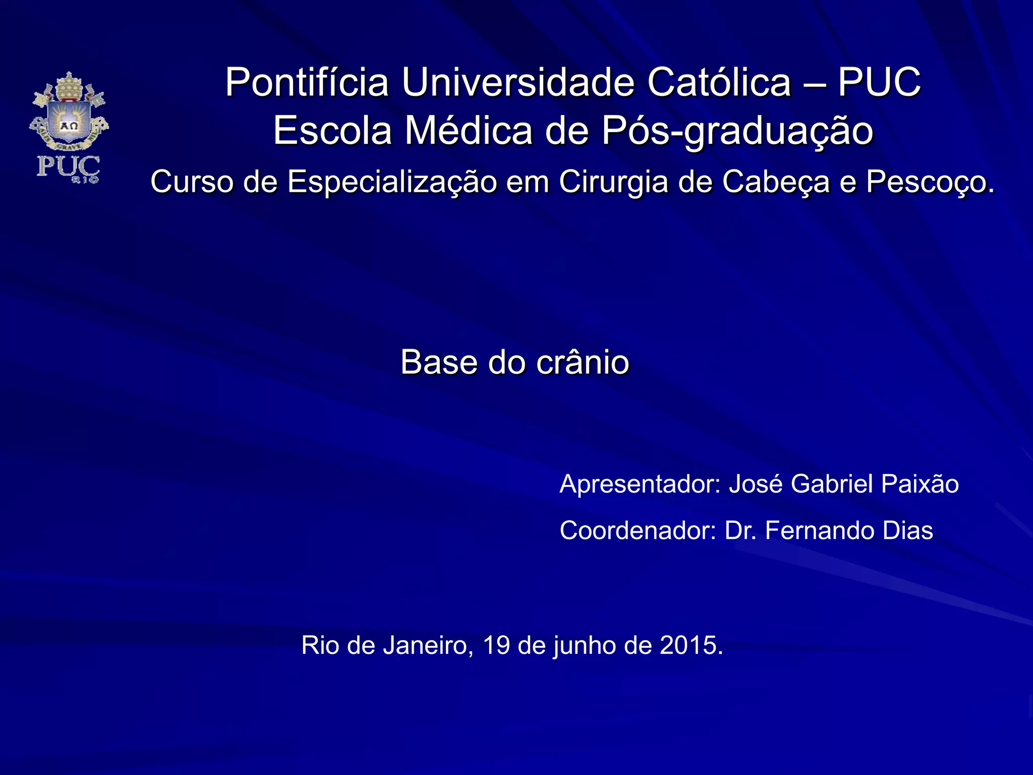 O documento apresenta as principais estruturas da base do crânio, incluindo suas divisões em fossas anterior, média e posterior. Detalha os limites, forames e conteúdos de cada fossa, assim como suas relações anatômicas. Também discute brevemente tumores de base de crânio e a importância da topografia para o diagnóstico.