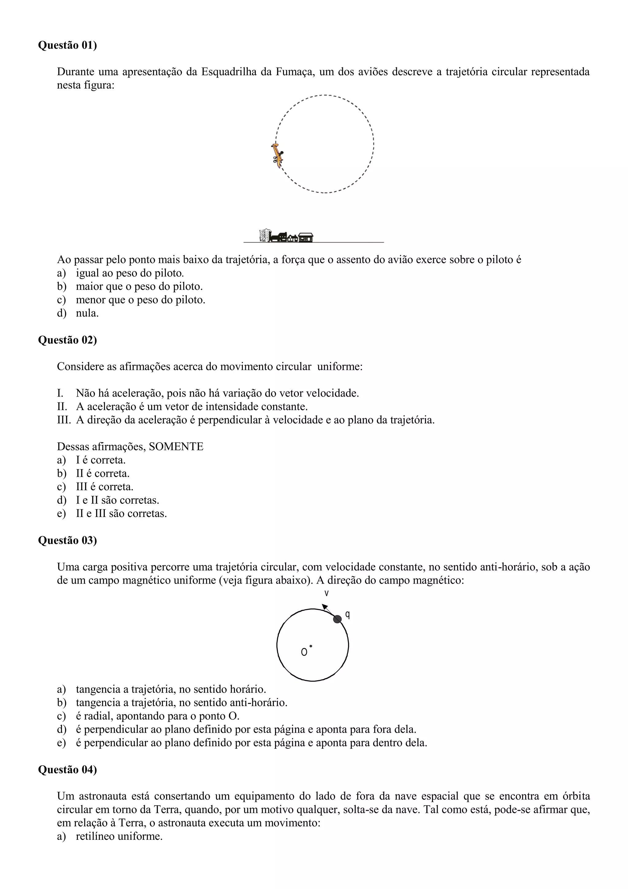 O documento contém 20 questões sobre mecânica newtoniana, especificamente sobre movimento circular uniforme. As questões abordam conceitos como força centrípeta, aceleração centrípeta, velocidade angular, frequência de rotação e suas relações com o raio das circunferências em movimento circular.