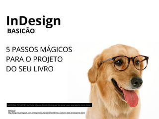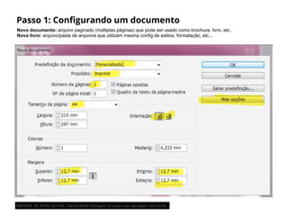 O documento apresenta 5 passos para projetar um livro no InDesign: 1) configurar o documento definindo margens, sangrias e espaçadores; 2) criar páginas mestres para padronizar elementos; 3) importar e encadear textos usando estilos de parágrafo; 4) inserir imagens e texto com contorno; 5) exportar para impressão.
