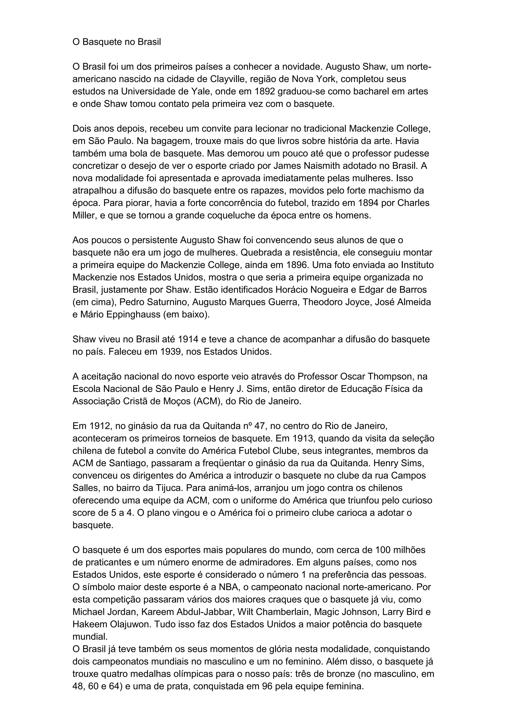 O documento descreve a história do basquete no Brasil desde sua introdução no final do século XIX pelo professor norte-americano Augusto Shaw no Mackenzie College em São Paulo. O esporte se espalhou lentamente devido à resistência masculina, mas Shaw organizou a primeira equipe de basquete do Brasil no Mackenzie College em 1896. Posteriormente, Oscar Thompson e Henry Sims ajudaram a popularizar o basquete no país no início do século XX.
