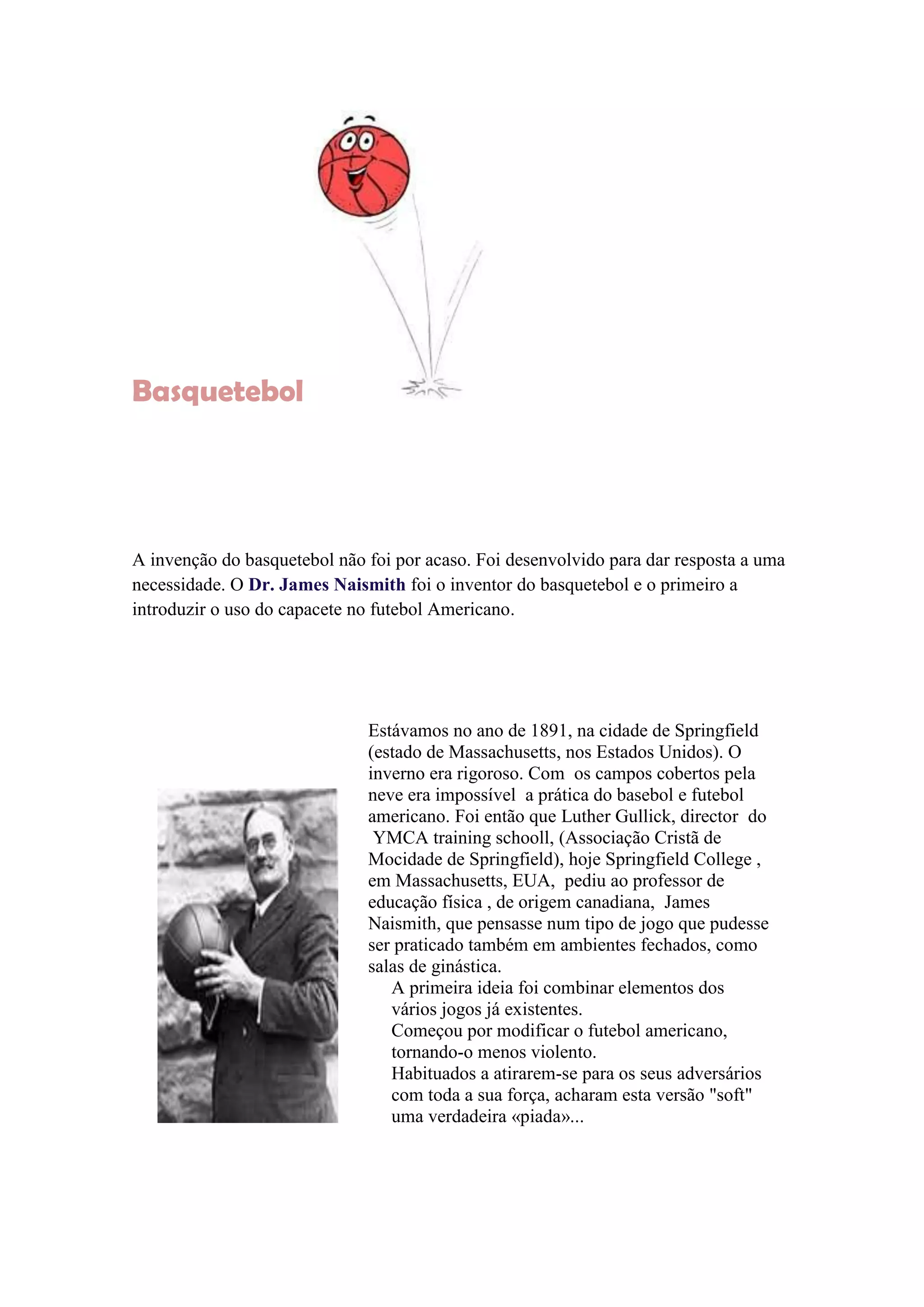 O basquetebol foi inventado em 1891 por James Naismith na cidade de Springfield, Massachusetts para ser um jogo que pudesse ser praticado em ambientes fechados durante o inverno. Ele pendurou dois cestos de fruta em lados opostos do ginásio e estabeleceu 13 regras iniciais para o novo jogo, que foi chamado de "basket ball". O primeiro jogo teve lugar entre dois times de 9 jogadores e terminou com placar de 1 a 0.