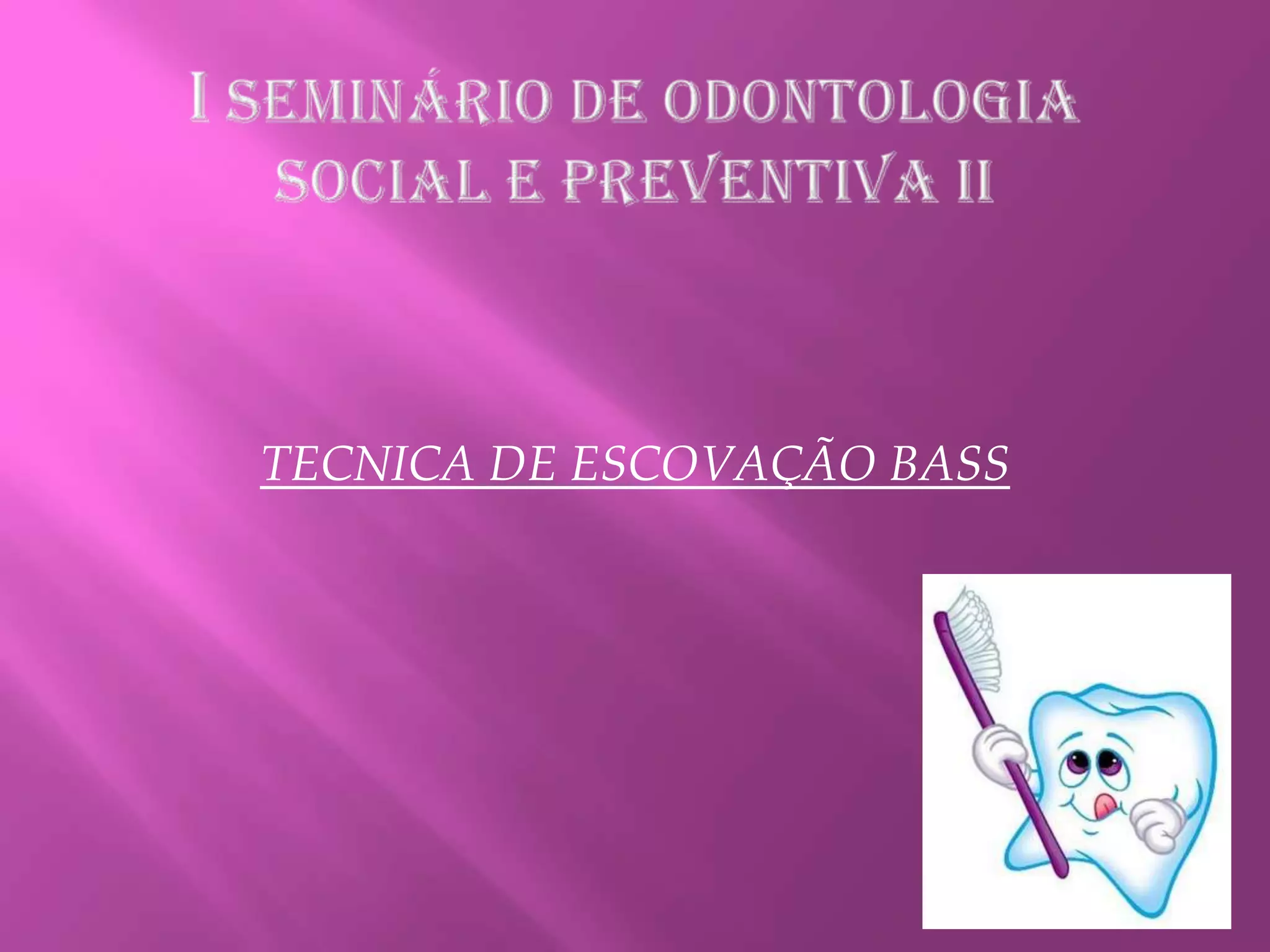 O documento descreve um seminário de odontologia social e preventiva que apresentou a técnica de escovação BASS. Dois acadêmicos, Fabiula Tecchio e Liz Ferreira, apresentaram a técnica enquanto Niéphore Niépce e Paulo Bosisio também participaram do evento.
