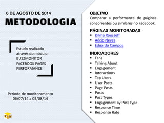 A página da candidata Dilma Rousseff teve maior engajamento dos seguidores no Facebook em comparação às páginas dos candidatos Aécio Neves e Eduardo Campos, com taxas de crescimento, interações e histórias ("Talking About") superiores. Embora as páginas de Aécio e Eduardo tenham mais seguidores no total, os usuários parecem mais ativos e envolvidos com o conteúdo da página de Dilma.