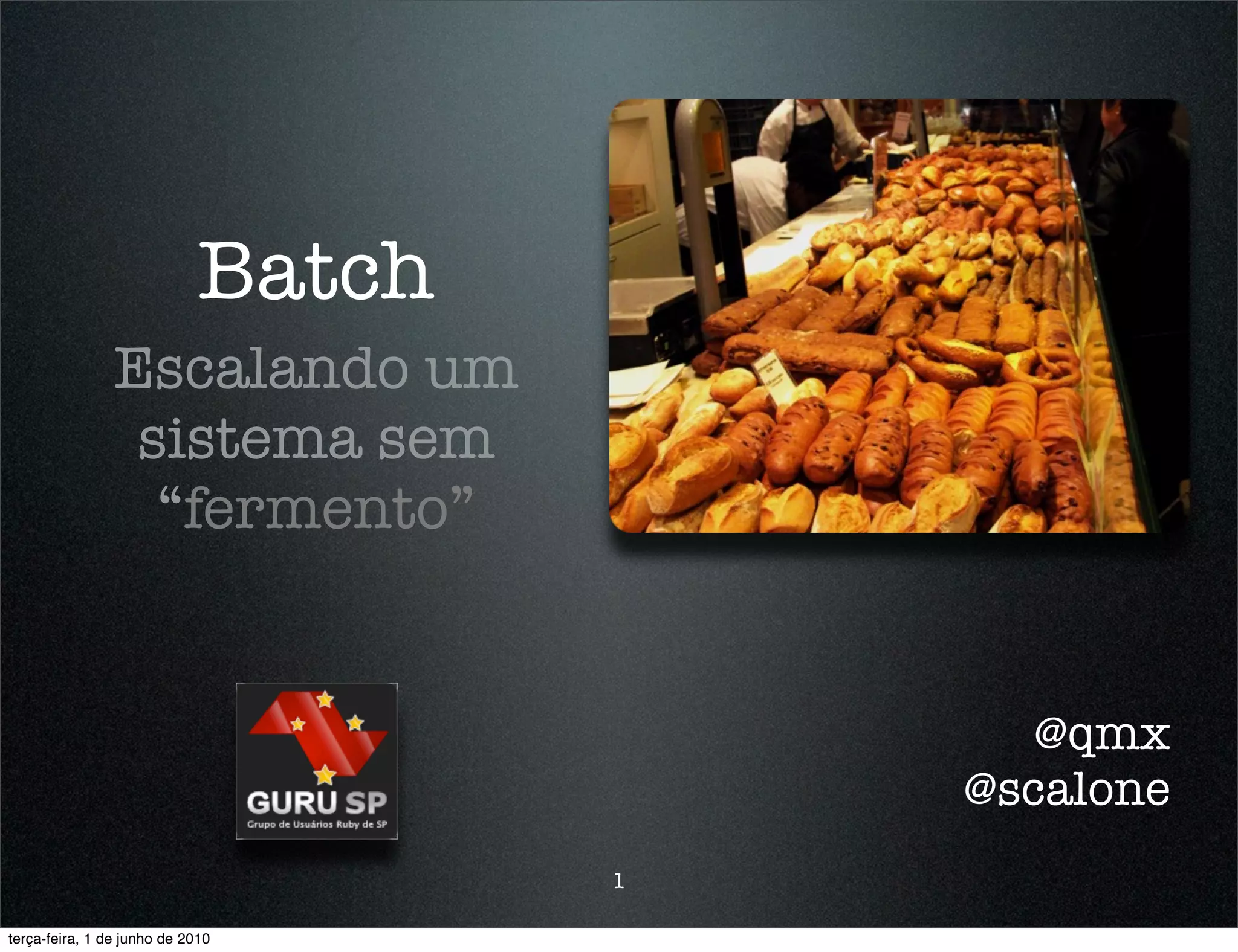 O documento discute a escalabilidade de sistemas, utilizando uma metáfora com a panificação. Ele explora ferramentas de gerenciamento de tarefas como DJ e BJ, comparando vantagens e desvantagens, além de sugerir soluções para problemas enfrentados. O texto também menciona a importância de monitoramento e fornece exemplos de uso em casos práticos.