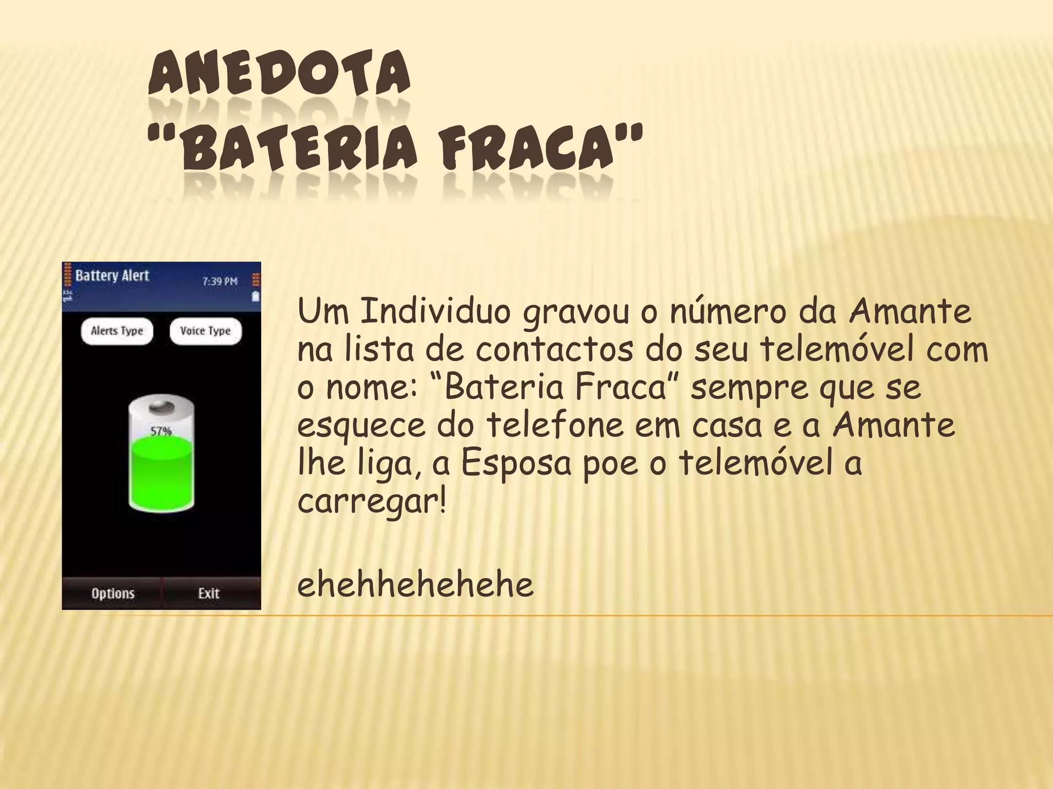 Um homem gravou o número da amante no celular como "Bateria Fraca" para que quando ela ligasse e a esposa visse, achasse que era apenas a bateria fraca, evitando suspeitas. A situação mostra uma trapaça para manter um caso extraconjugal em segredo.